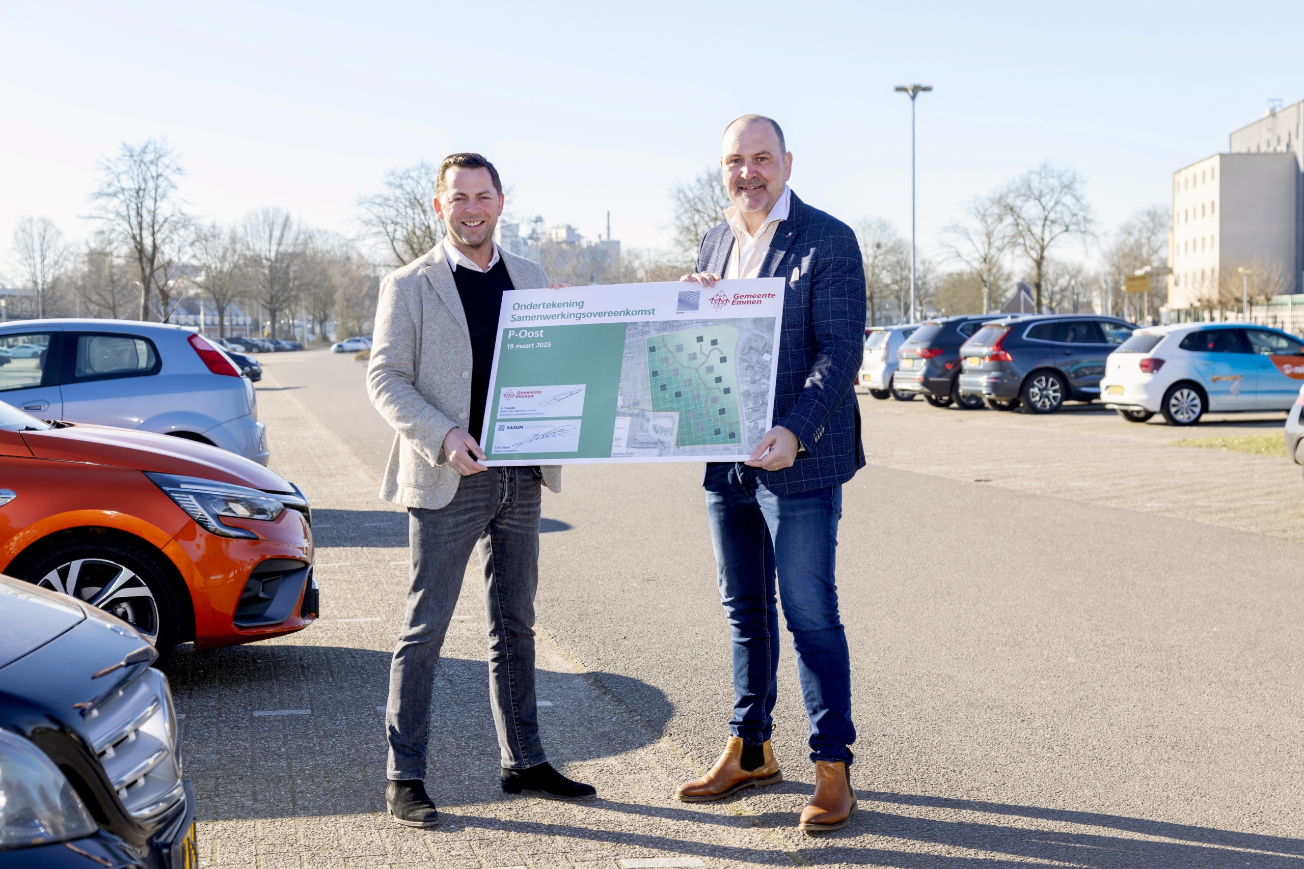 De realisatie van 32 hoogwaardige woningen op een deel van het parkeerterrein P-Oost in het centrum van Emmen is een stap dichterbij. Op woensdag 19 maart zette wethouder Albert-Jan Jakobs samen met Jorgen Kruit van Truckpoint R.E.D. B.V. de handtekening onder de samenwerkingsovereenkomst voor deze locatie. Met het tekenen van de overeenkomst staan de lichten op groen voor het verder uitwerken van de plannen.